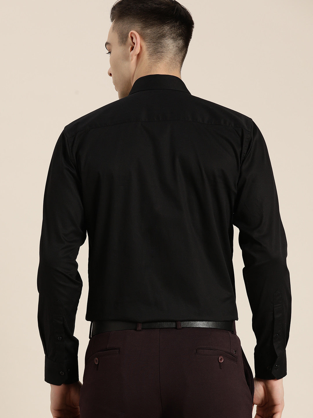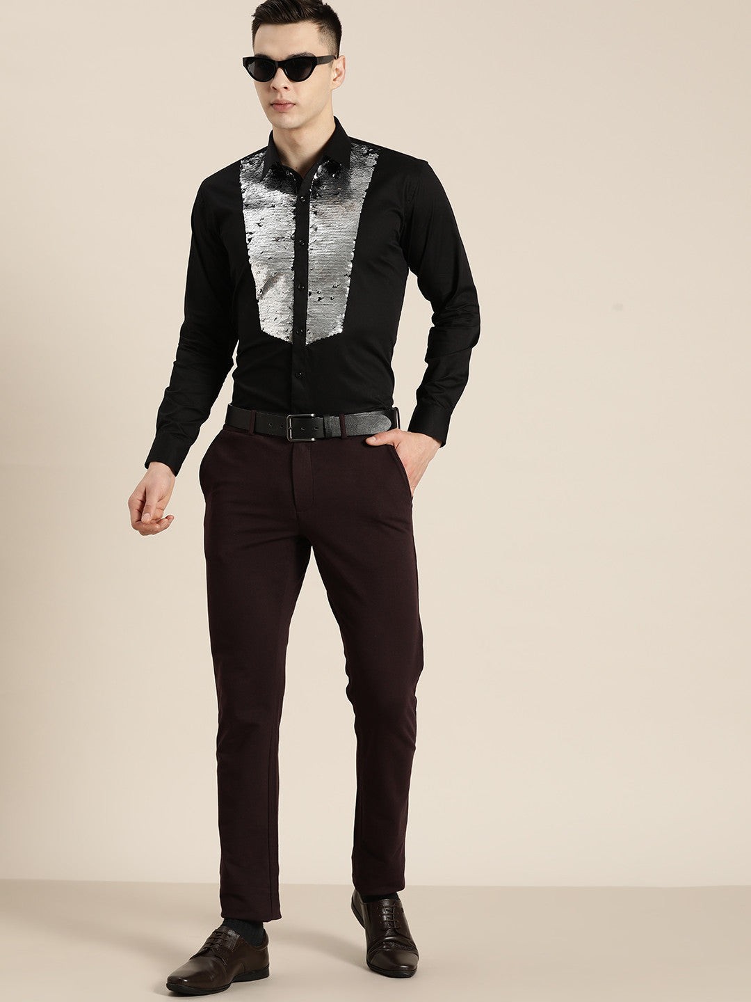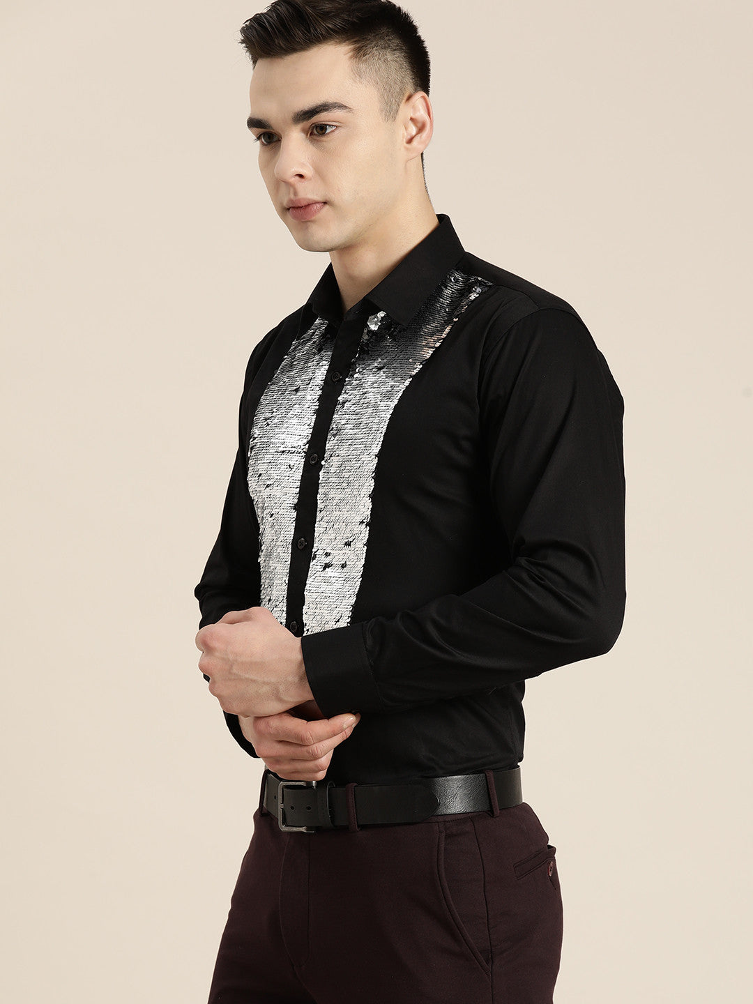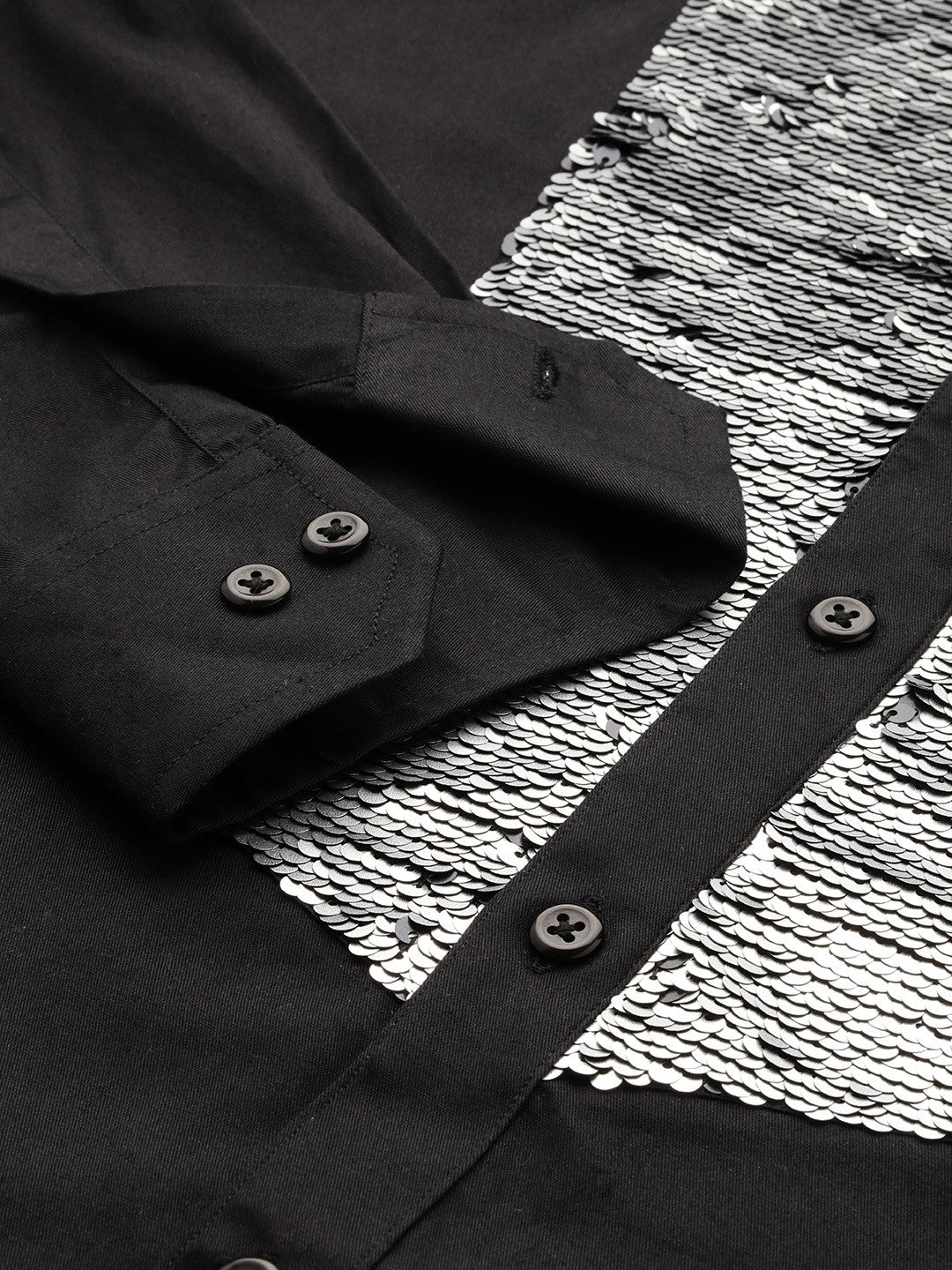 Black solid sequened tuxedo party shirt , has a spread collar, button placket, long regular sleeves, is made with pure cotton satin fabric and a curved hem