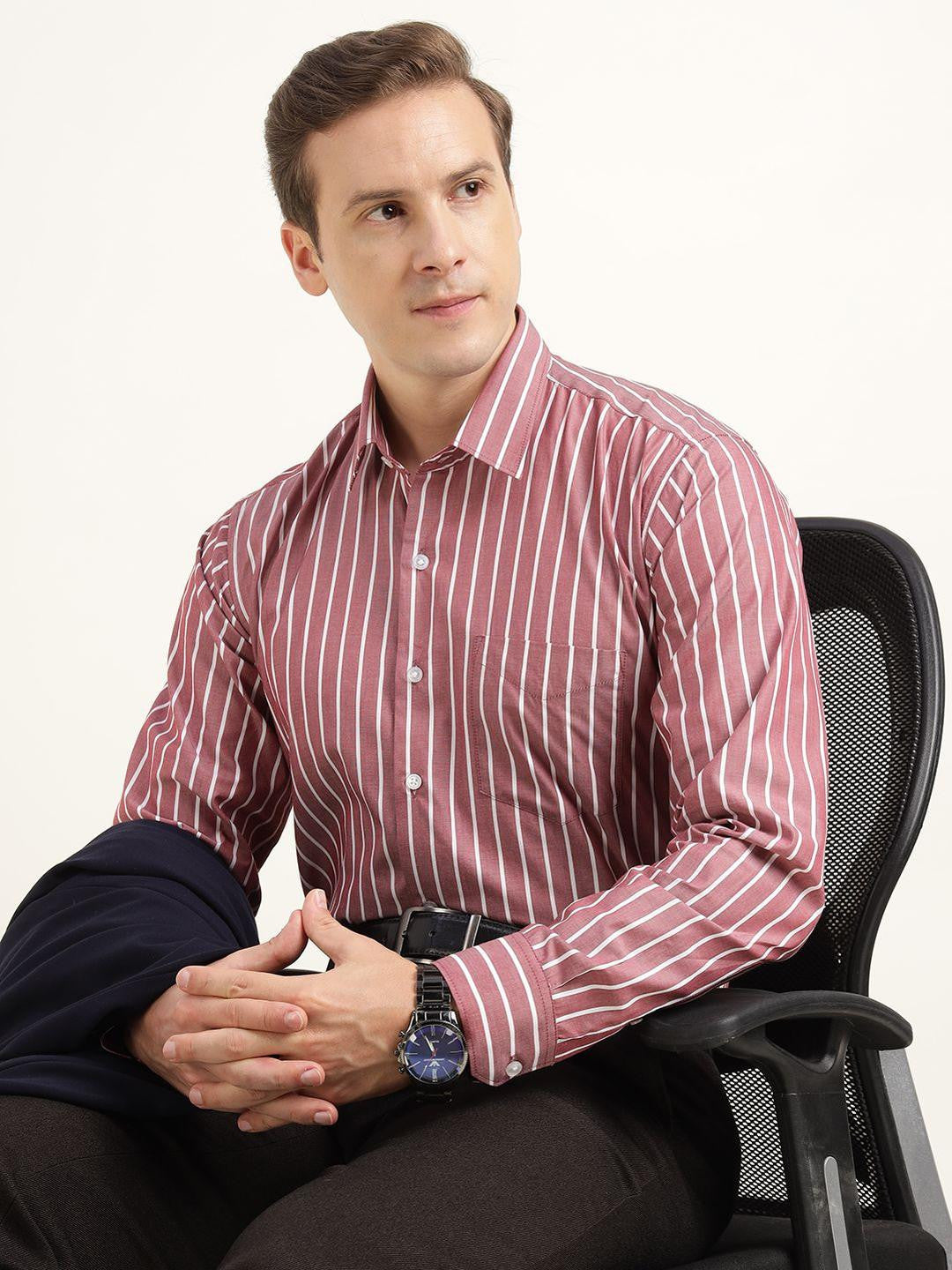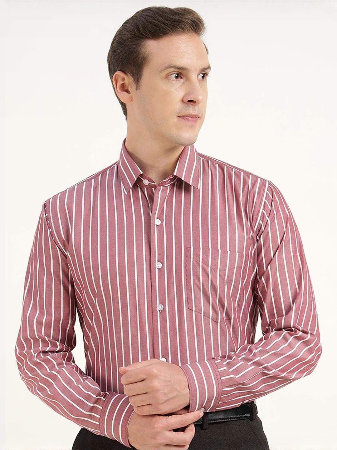 Hancock Men Maroon & White Striped Pure Cotton Slim Fit Formal ShirtSkip to content