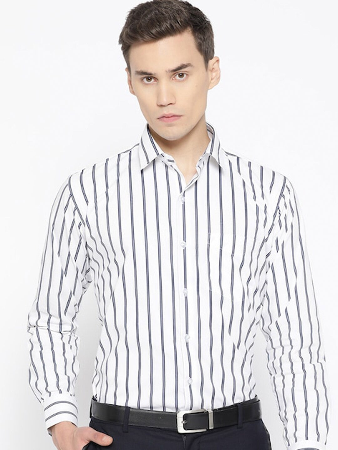 White and navy blue vertical Striped striped formal shirt in plus size, has a spread collar, button placket, 1 patch pocket, long regular sleeves and has a curved hem