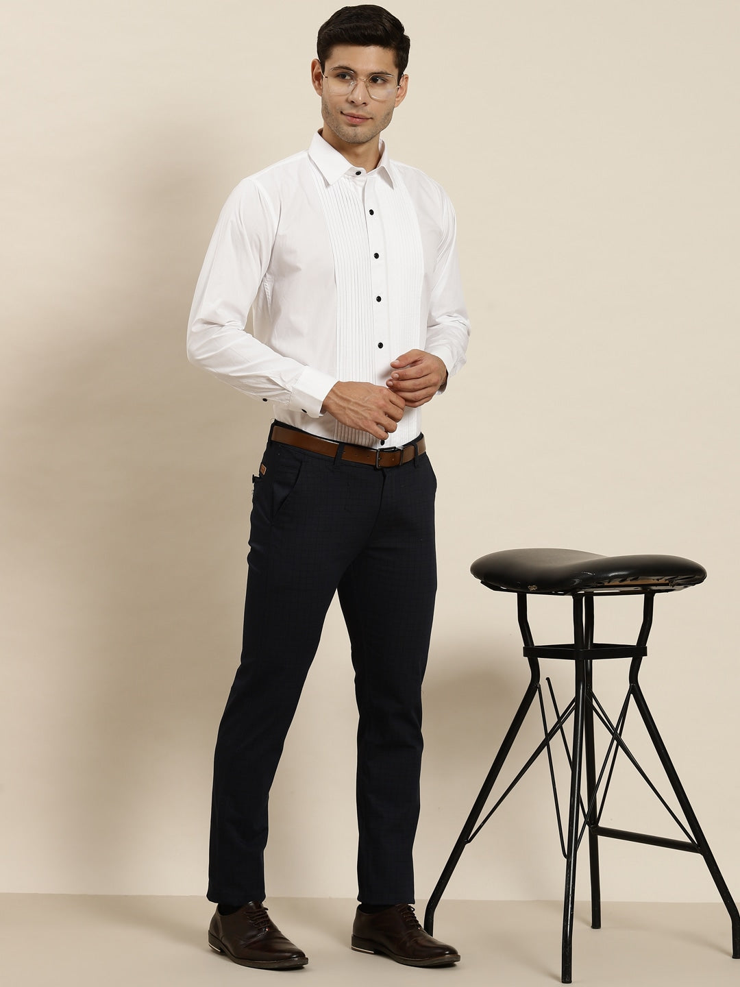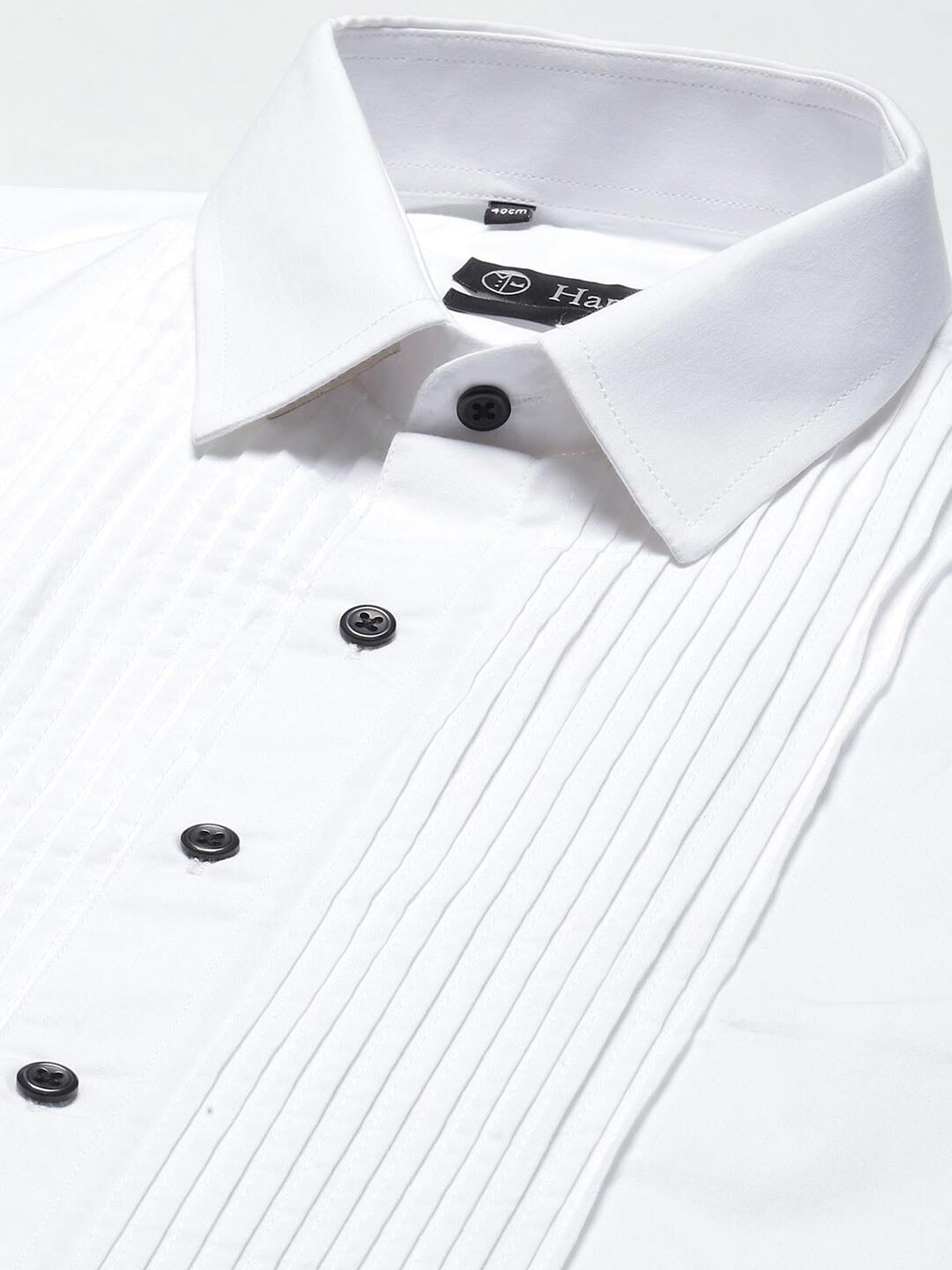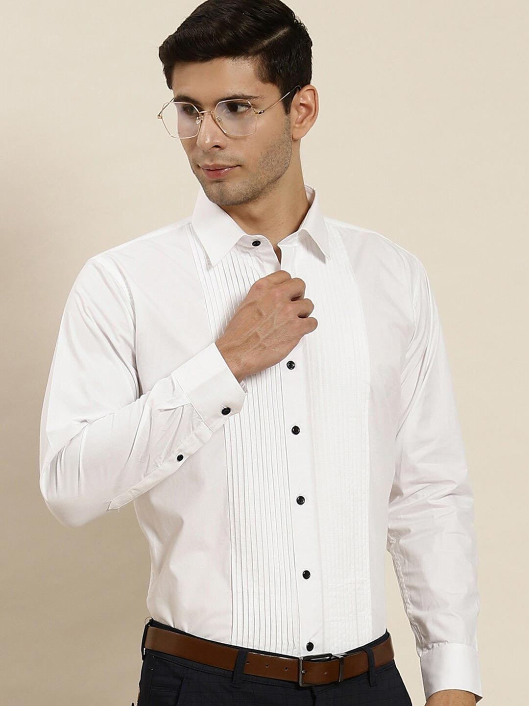 White solid pintucked tuxedo party shirt in plus size, has a spread collar, button placket, long regular sleeves, is made with pure cotton fabric and a curved hem
