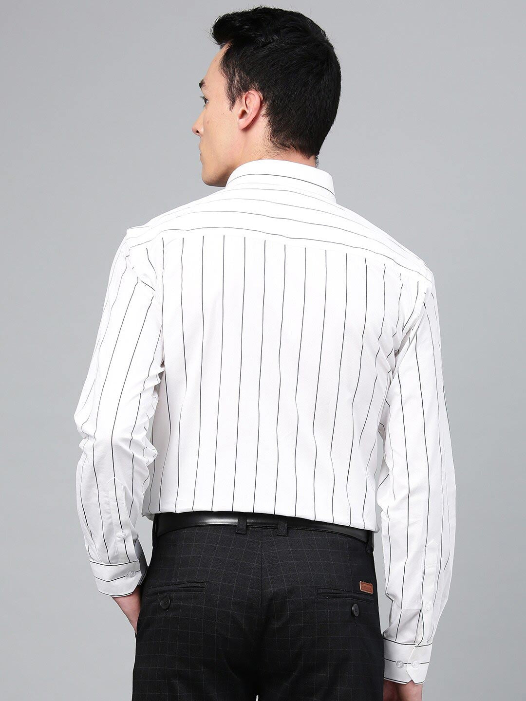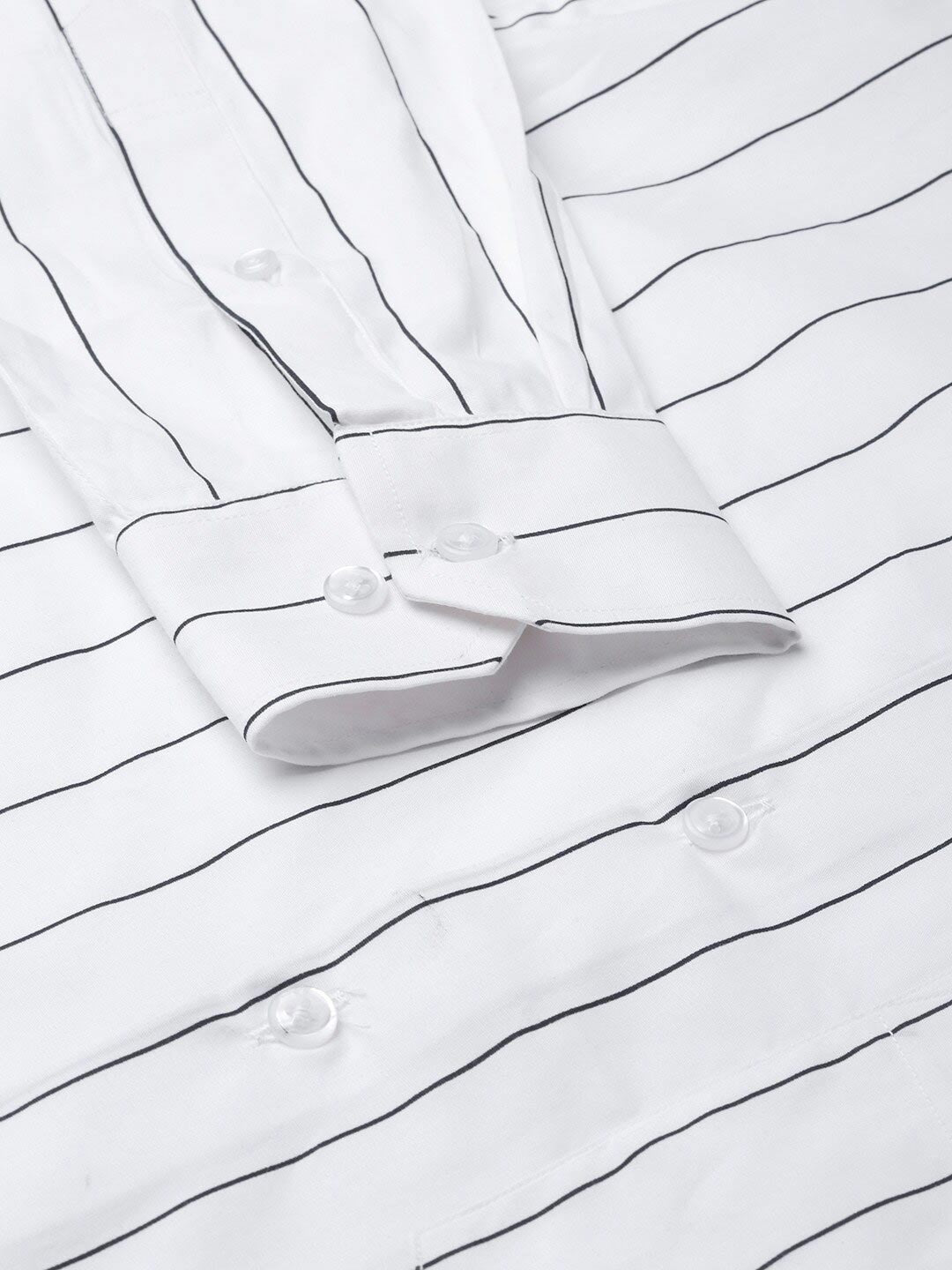 White vertical Striped striped formal shirt in plus size, has a spread collar, button placket, 1 patch pocket, long regular sleeves and has a curved hem