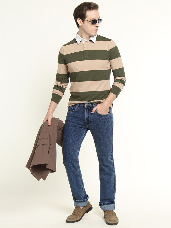 Hancock Men Beige & Olive Striped Bio Finish Pure Cotton Stretch Pique Polo Collar T-shirt