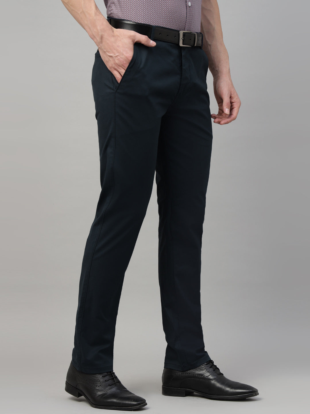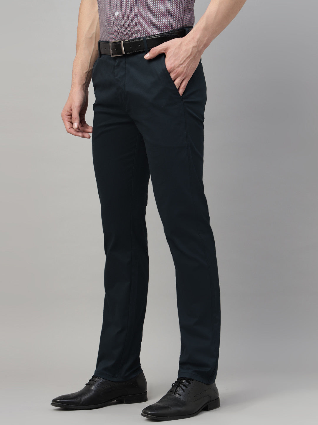 Men Navy Blue Solid Cotton Elastene Slim Fit Formal Trouser