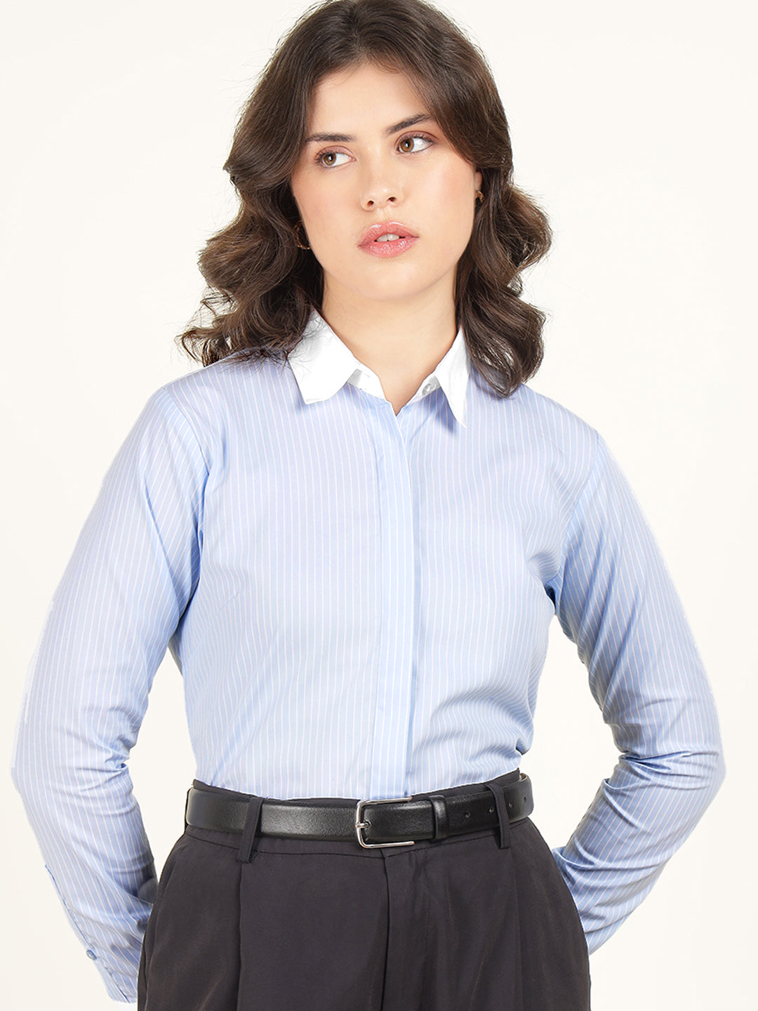 Hancock Women Sky Blue Striped Pure Cotton Regular Fit Formal Shirt